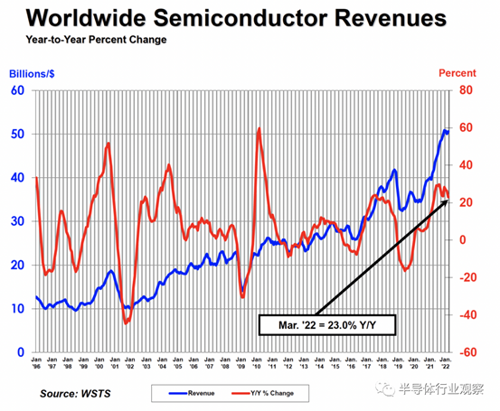 半導(dǎo)體行業(yè)協(xié)會(huì) (SIA) 統(tǒng)計(jì)數(shù)據(jù)顯示,2022年第一季度全球半導(dǎo)體銷售額達(dá)到 1517億美元,較去年同期增長23%。但比2021年第四季度低0.5% 。2022年3月全球銷售額為506億美元,環(huán)比增長1.1%。
